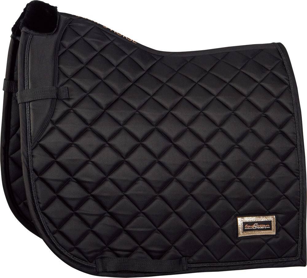 Tapis de selle de luxe avec rembourrage épais et doux de mousse PU de 1,5 cm et polyfill 200 gr et doublé d'un polyester à mailles à séchage rapide. Rembourrage supplémentaire sur le devant. Cousu en diagonale et muni d'un cordon et d'un badge avec des paillettes et un imprimé Equestrian Society. Équipé d'une boucle de sangle et de boucles de selle.
