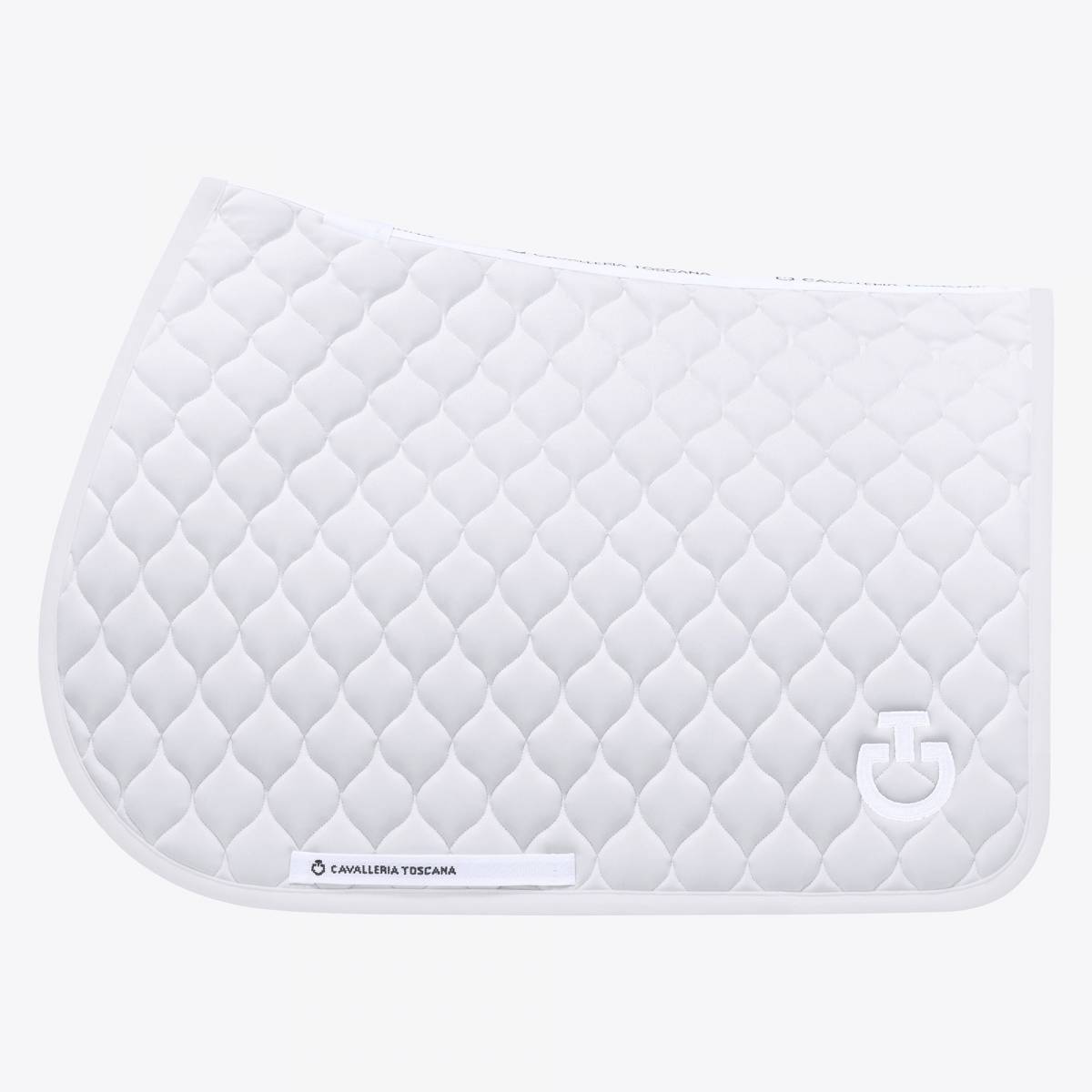 Tapis de selle modèle Circular, coloris blanc, fabriqué à partir de jersey technique respirant. Sa forme anatomique garantit un ajustement optimal, tandis que le tissu en coton nid d'abeille 3D assure une excellente adhérence tout en maintenant la respirabilité.
