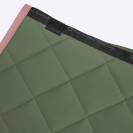 Tapis de selle modèle DIAMOND QUILTED coloris olive bord rose fabriqué à partir de jersey technique respirant. La forme anatomique permet un ajustement optimal et est combinée à un tissu coton nid d'abeille 3D qui offre la bonne adhérence et maintient la respirabilité.