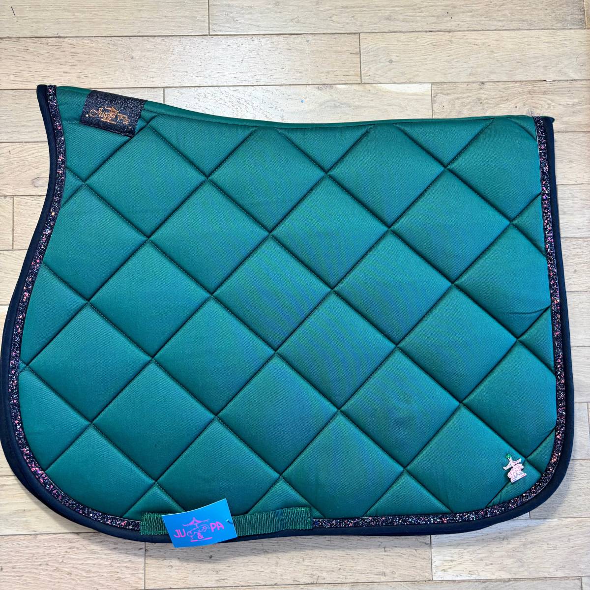 Tapis matelassé en Italie et fabriqué en France, ce modèle se distingue par son coloris bleu canard, son bord noir et son liseré à paillettes multicolores, ajoutant une touche de peps à votre équipement.