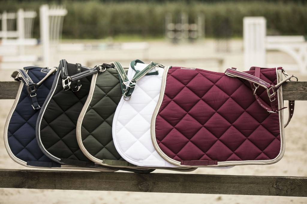 Tapis de selle "Élégance", 100 % coton, garniture synthermax 360 g et doublure traitée en carbone de bambou. Finition avec corde et bord satiné.