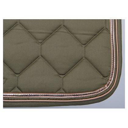 Tapis de selle avec passepoil en or rose. Remplissage de mousse PU 10 mm et polyfill 250gr, doublure à séchage rapide pour une ventilation optimale et une évacuation rapide de l'humidité, boucles pour la sangle et la selle.