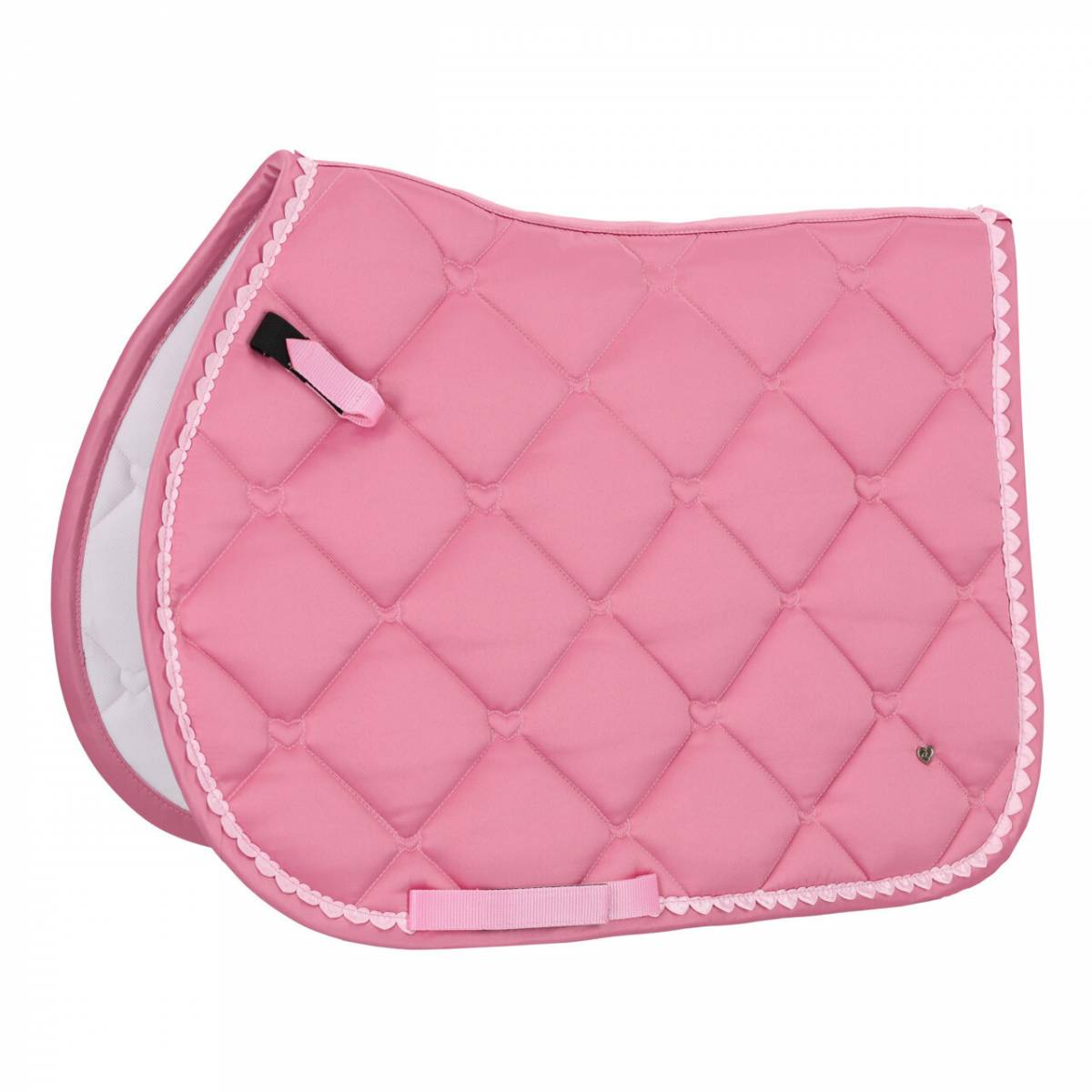 Tapis de selle de la collection Lyvia, conçu pour épouser parfaitement la forme du dos de votre cheval tout en ajoutant une touche esthétique avec ses motifs et sa bordure en forme de cœur.