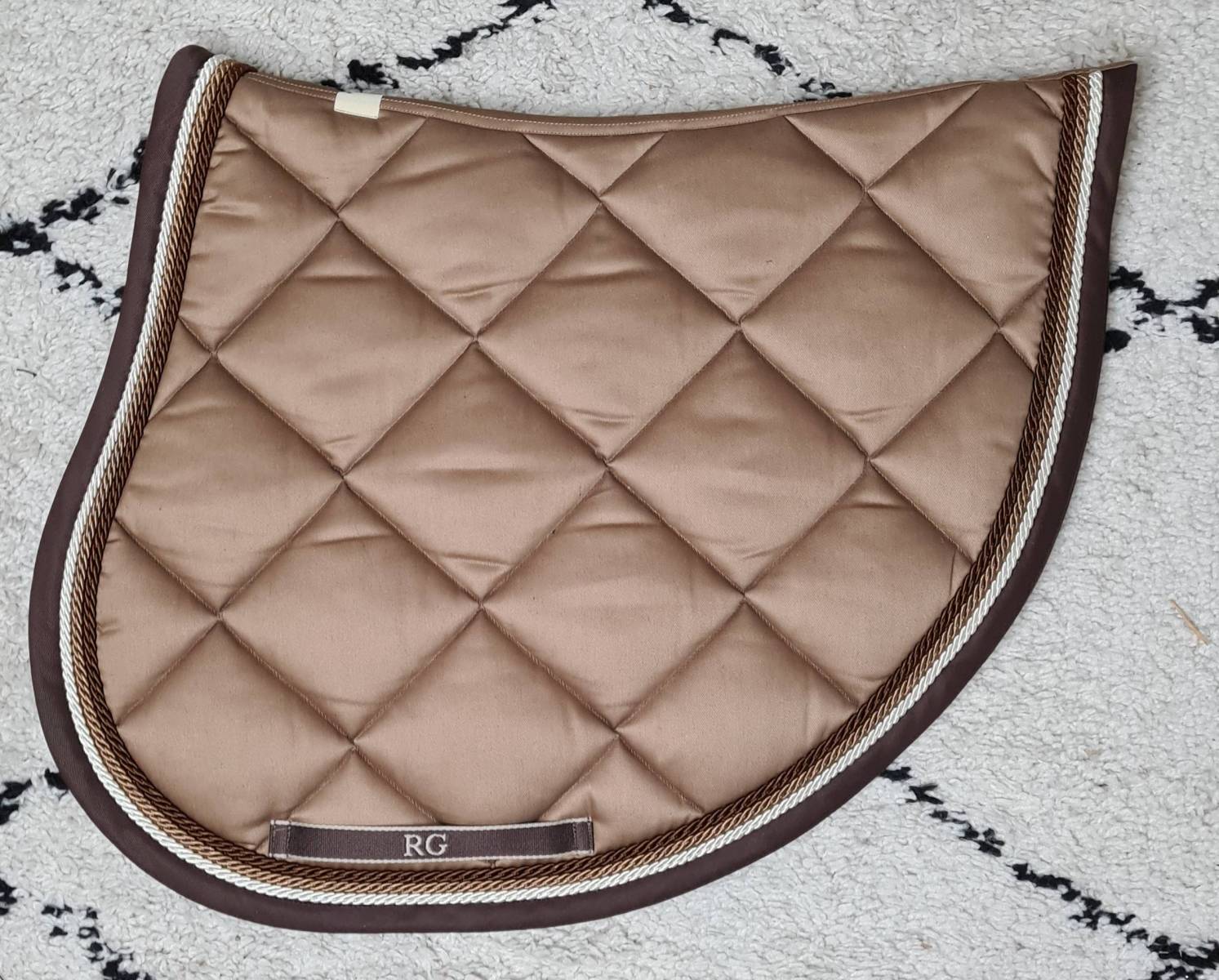 Tapis de la marque RG Italy en coton de couleur Marron glacé: -Doublure intérieure: nid d'abeille, permettant d'aspirer la transpiration du cheval et de le garder au sec -Composé de 3 cordelettes: une extérieure beige, une camel et une intérieure chocolat . -Entouré d'un liseré chocolat