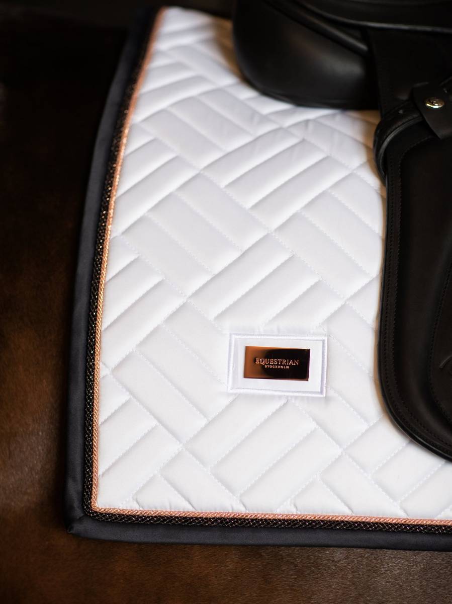 Tapis de selle élégant avec des surpiqures modernes blanches avec des détails dark ocean et rosegold. Décoré du badge Equestrian Stockholm en rosegold