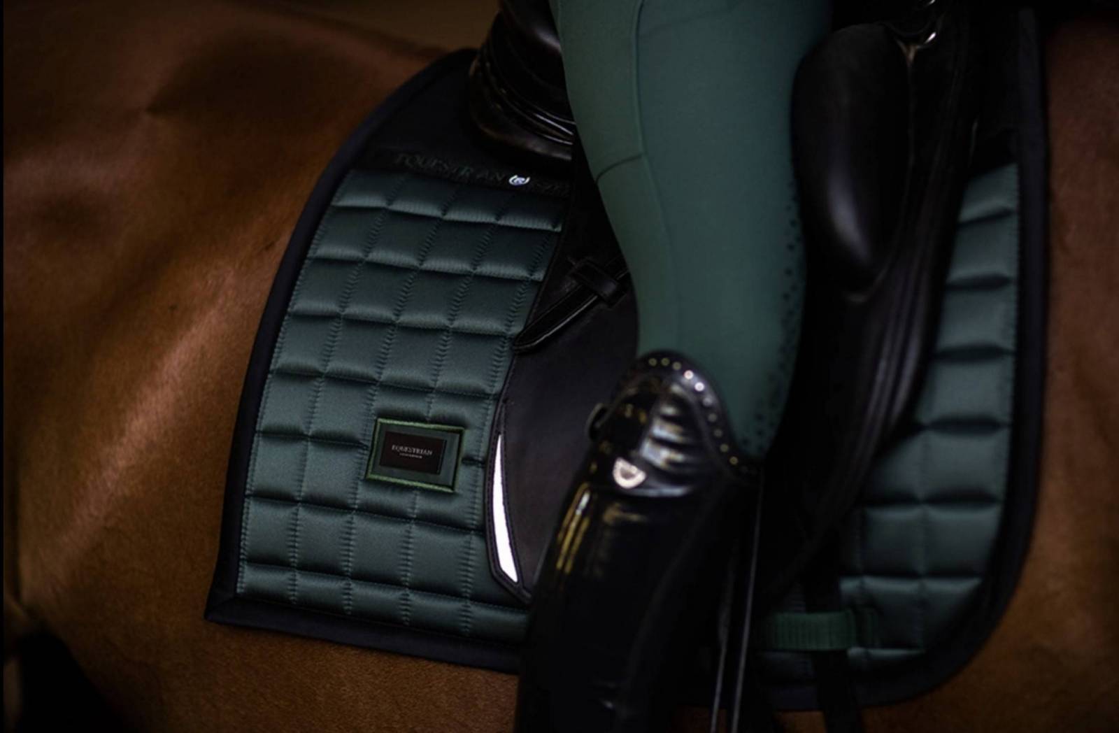 Tapis de selle au design sportif vert foncé, avec du mesh noir décoratif et un badge Equestrian Stockholm noir.
