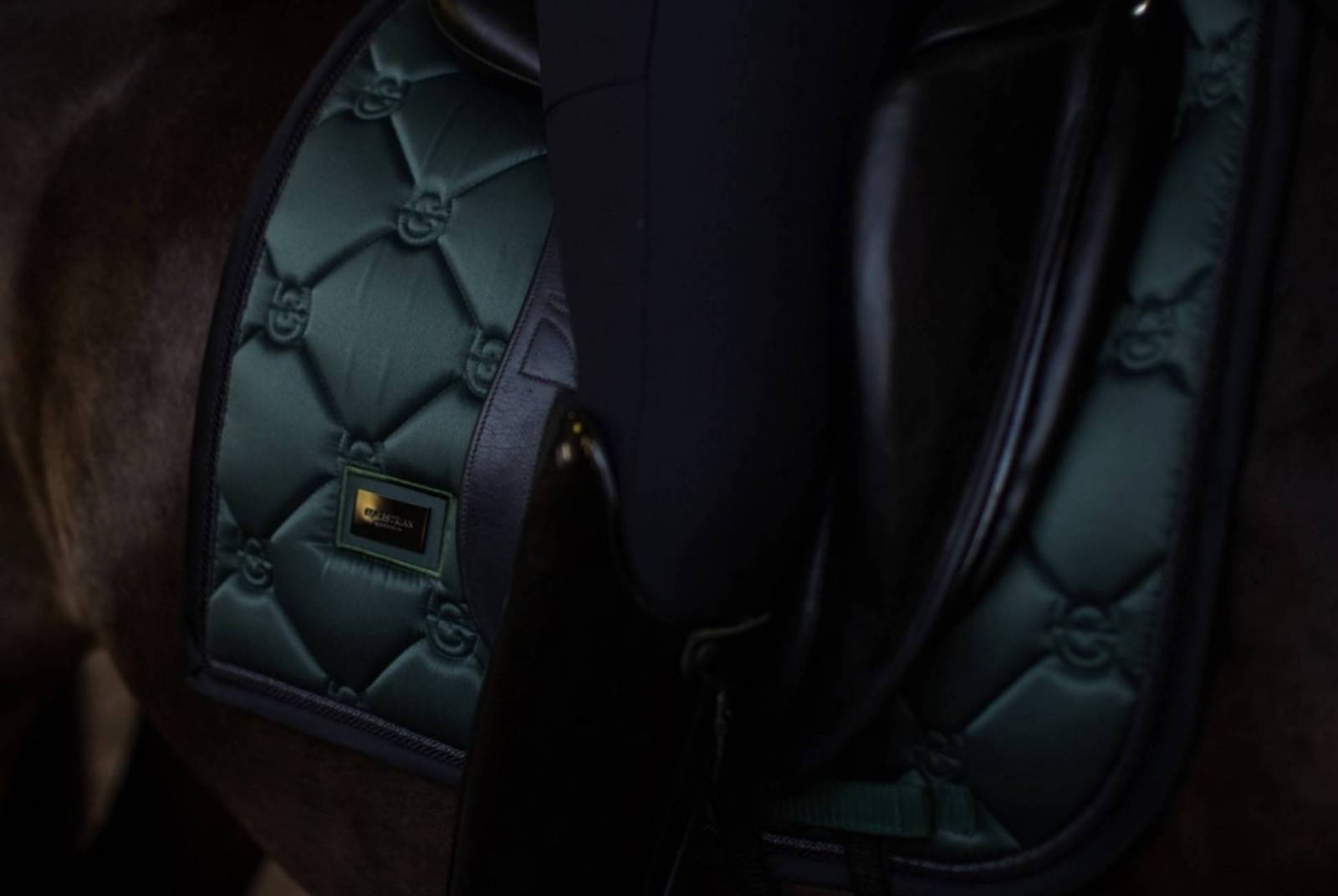 Tapis de selle élégant en vert foncé et avec des détails noir et chrome.