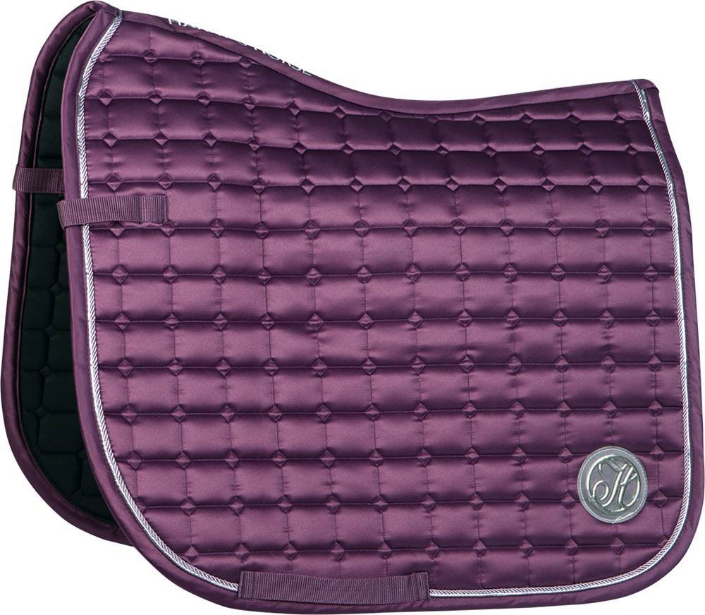 Tapis de selle en matière luxueuse "Satin". Équipé d'un cordon et d'un passepoil métallique. Équipé d'un passant de sangle et de velcro sur les attaches de contre sanglons
