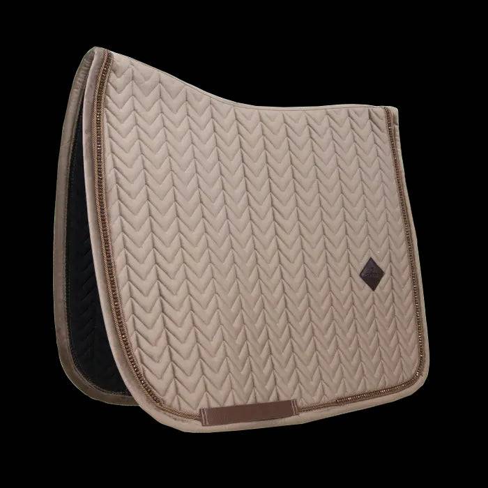 Le tapis de selle Velvet Pearls n'a pas de sangles gênantes à fixer à la selle. Pour rester en place sous la selle, l'intérieur du tapis est structuré en gaufre. Cet intérieur gaufré sèche rapidement et offre un effet amortissant sous la selle. Pour que vos bottes ne soient pas endommagées par les perles, il y a une découpe spéciale pour les perles à côté du passage de sangle. L'écusson en cuir artificiel est placé un peu plus haut sur le tapis de selle pour laisser de la place à la broderie.