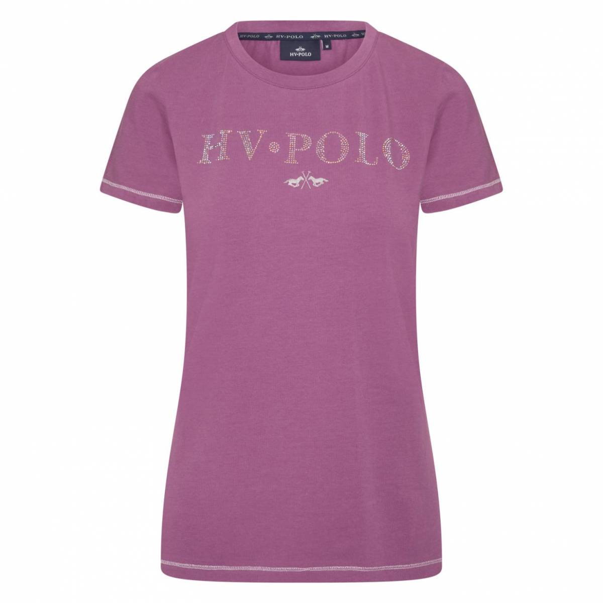 T-shirt sophistiqué à col ras du cou. Illustration super riche sur la poitrine avec HV Polo en strass et logo imprimé en métal. Coutures en lurex à la base et aux poignets. Une pièce de monnaie de marque est appliquée sur le côté gauche de l'ourlet sur le devant.