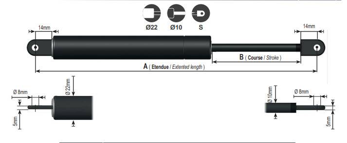 Vérin à gaz soudée 800n - Entraxe 785mm