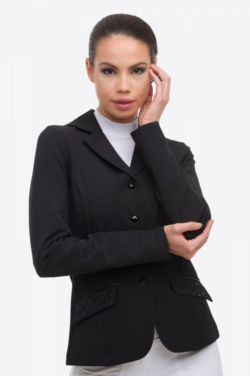 La vraie beauté réside toujours dans les détails. Découvrez les décorations noires de cette veste : comme les cristaux noirs sur la poche et les passepoils laqués noirs. Cette veste de concours a été conçue avec une coupe spéciale, composée de plusieurs panneaux au dos, et présente une coupe particulière aux coudes. Elle s'adapte à toutes les disciplines grâce à son design classique et à ses solutions techniques qui permettent une totale liberté de mouvement tout en offrant un grand confort.