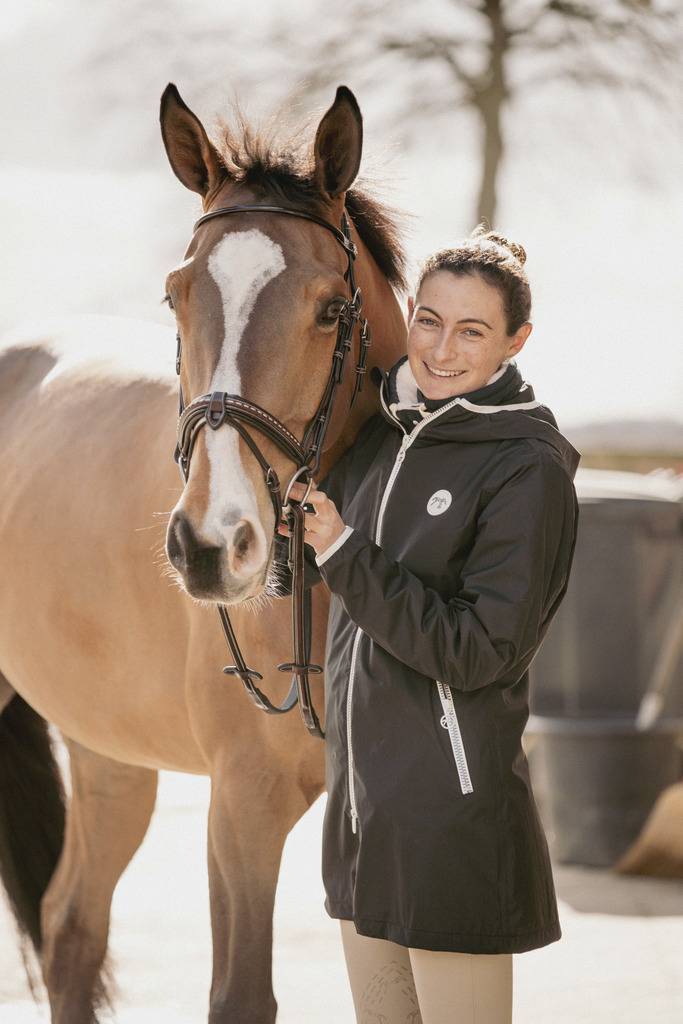 Sans doublure et très léger à porter, une frise du logo Pénélope est visible sur la face intérieur du vêtement. Il se porte aisément à cheval grâce à son zip à double sens et sa fente à l'arrière. Il s'enfile également très facilement en ville.