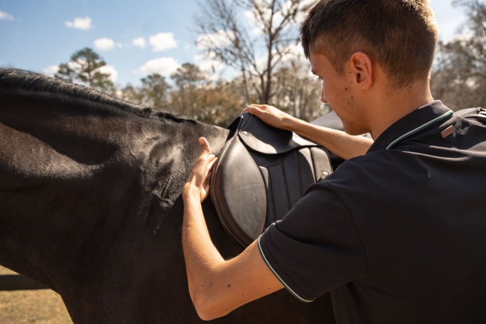 Il repère ensuite la 13ème dorsale qui est la clé de voûte du cheval, c'est à cet endroit que le poids du cavalier doit reposer. Il va, ensuite, poser la selle sur le dos du cheval et vérifier que les matelassures soient entièrement en contact, le garrot et les épaules sont bien dégagés.